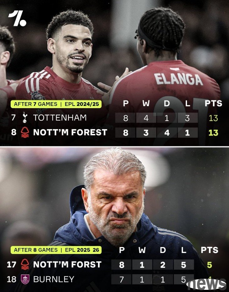 Nottingham Forest's record this season has plummeted. The team had 3 wins, 4 draws and 1 loss after the first 8 rounds last season and accumulated 13 points, ranking 8th. However, in the first 8 games of this season, it only ranked 17th with 1 win, 2 draws and 5 losses.