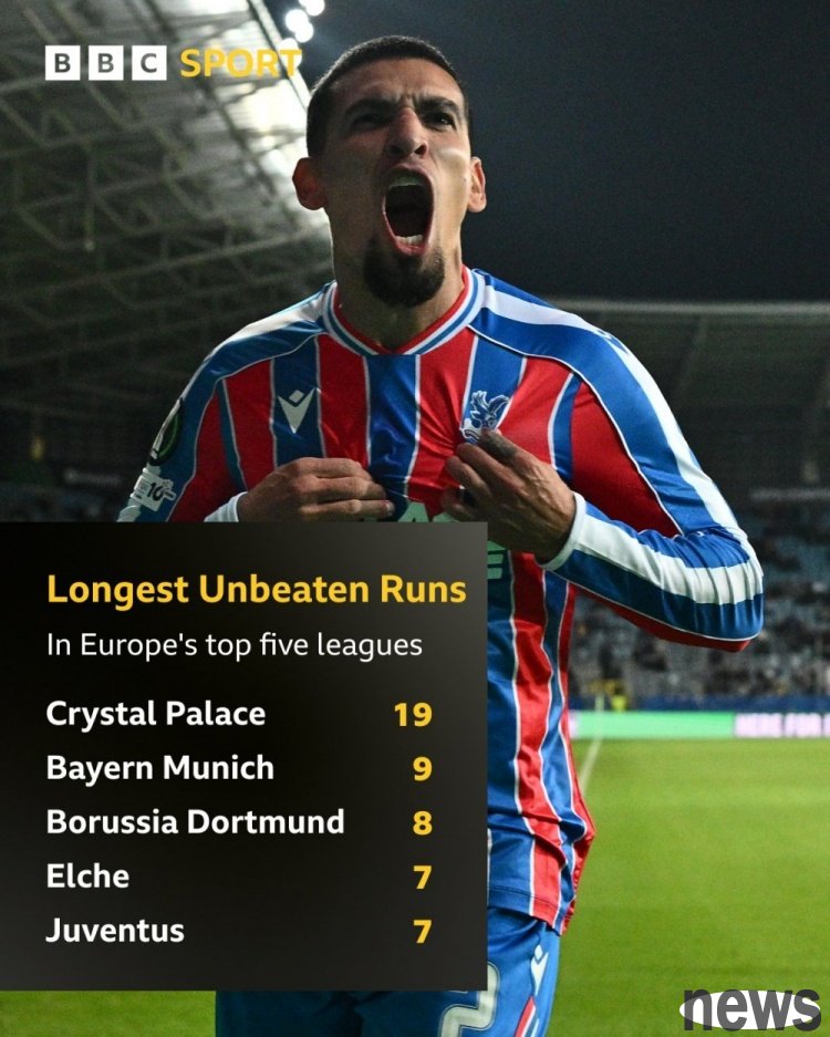 BBC counts the unbeaten games of the current five major league teams and lists the list. Crystal Palace ranked first in 19 games and Bayern took 9 games.