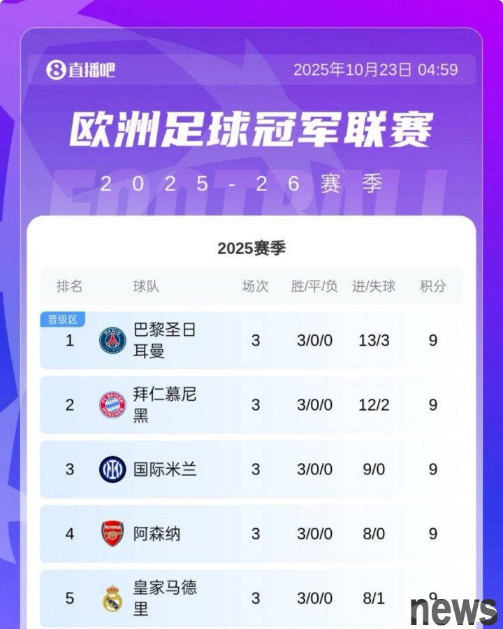 After the third round of the UEFA Champions League, five teams have won all three rounds and accumulated 9 points, namely French Ligue 1 team Paris, Bundesliga team Bayern, Serie A team Inter Milan, Premier League team Arsenal, and La Liga team Real Madrid.