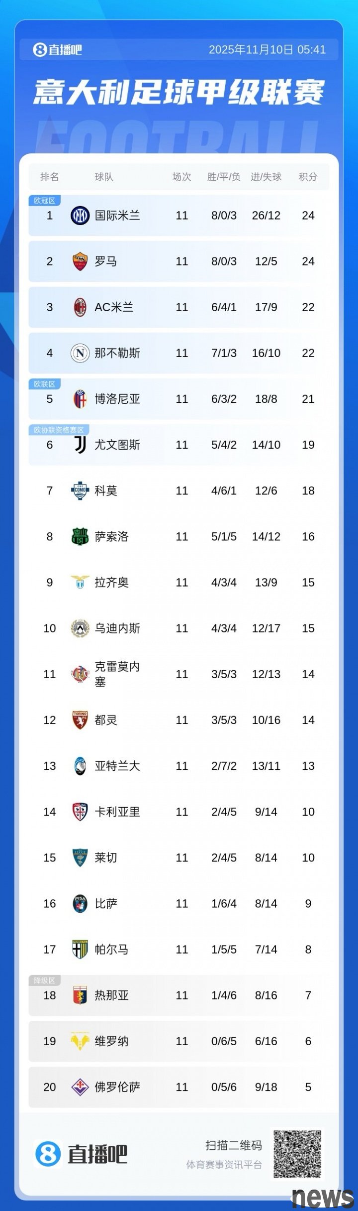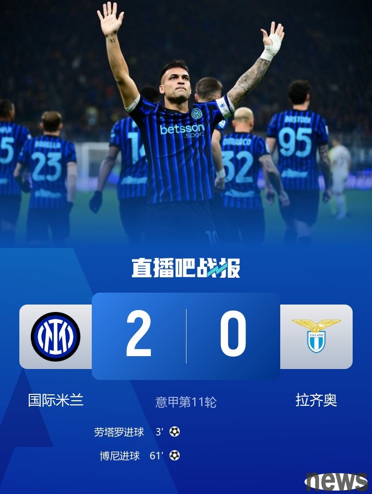 In the 11th round of Serie A, Inter Milan defeated Lazio 2-0 at home, Lautaro and Boni scored.