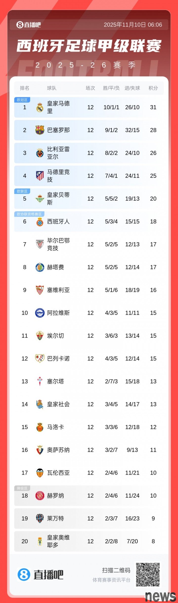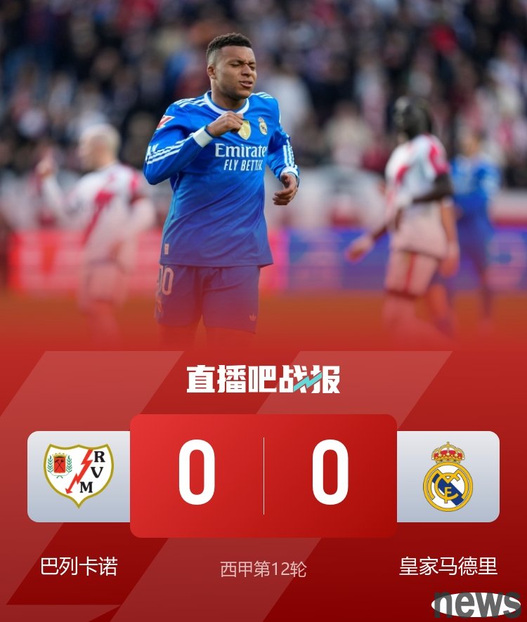 In the 12th round of La Liga, Rayo Vallecano drew 0-0 with Real Madrid, ending Real Madrid's four-game winning streak.