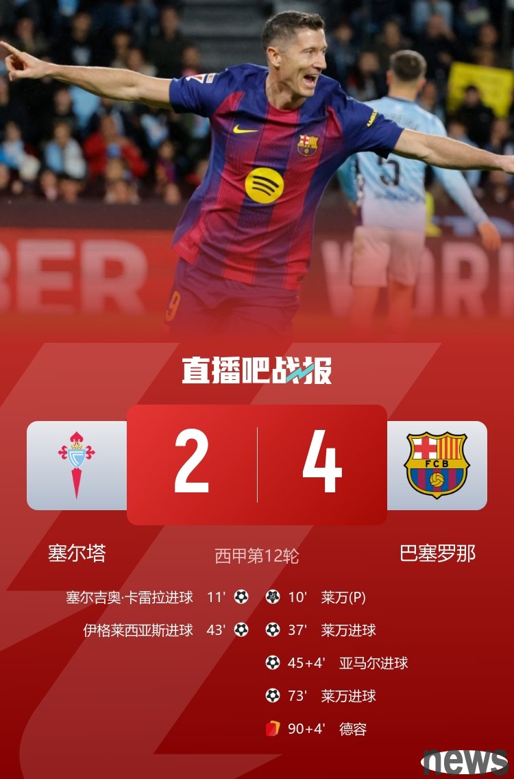Two consecutive league wins! Barcelona 4-2 Celta Vigo, 3 points behind the top spot, Lewandowski scored a hat-trick from Yamal
