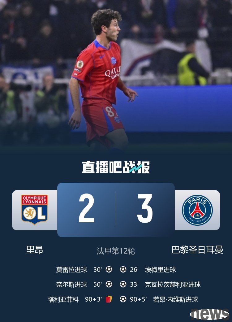 In the 12th round of Ligue 1, Paris defeated Lyon 3-2, and Joao Neves scored a stoppage time winner.