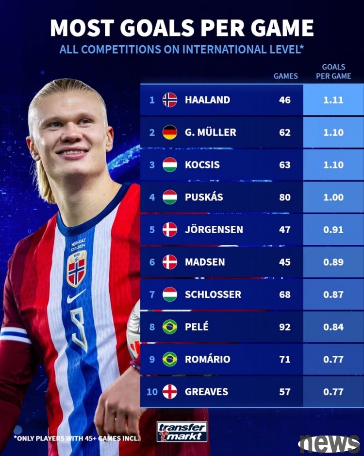 The German transfer market has compiled statistics on the average number of goals scored per game by players in the history of football for the national team and listed the list. Haaland leads the list with 1.11 goals, followed by Gerd Muller and Kirch.
