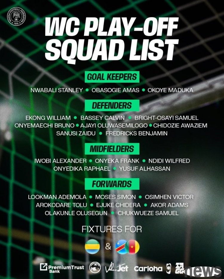 The Nigerian team announced a new roster of players. Nigeria will face Gabon in the semi-finals of the African World Cup preliminaries play-offs in November. If it wins, it will face the winner of Cameroon and Democratic Congo.