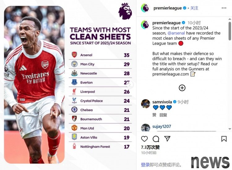 According to the official statistics of the Premier League, since the beginning of the 2023-24 season, Arsenal ranks first among all Premier League teams in clean sheets. They have not conceded a goal in 35 games.